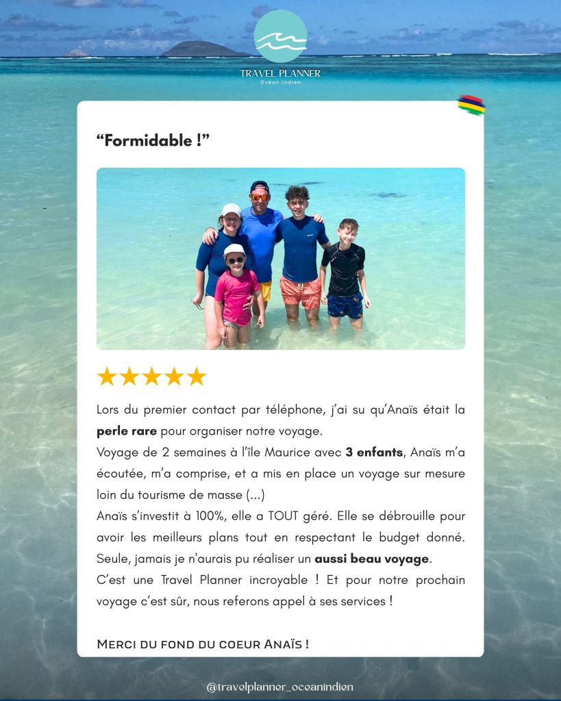 Anaïs.. MERCI ! Notre découverte de l'île Maurice en ce mois de décembre 2024 a été INCROYABLE. Votre écoute, votre aide et vos conseils ont été précieux. Vols, location de... Lire Plus voiture, logements, contacts locaux, tout était parfait !. Nous avons pu profiter de chaque instant pour découvrir l'île d'Ouest en Est et garderons ces moments gravés dans nos mémoires à jamais! Nos trois enfants ont été éblouis et fascinés par l'Océan. Nous avons passé un Noël en famille inoubliable. Mention spéciale à Fred, passionné et d'une gentillesse rare. Vivement la prochaine aventure ! Merci Anaïs!